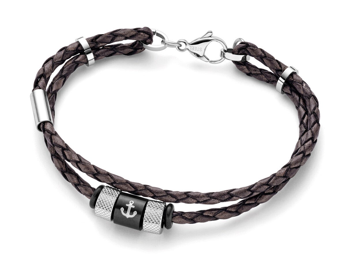Das handgeflochtene, dunkelbraune Leder schmiegt sich weich ans Handgelenk, während die 17,5 mm breiten Edelstahlelemente dem Armband einen maskulinen, modernen Akzent verleihen. Mit 3 mm Stärke und sicherem Karabinerverschluss verbindet es Komfort mit markantem Stil.