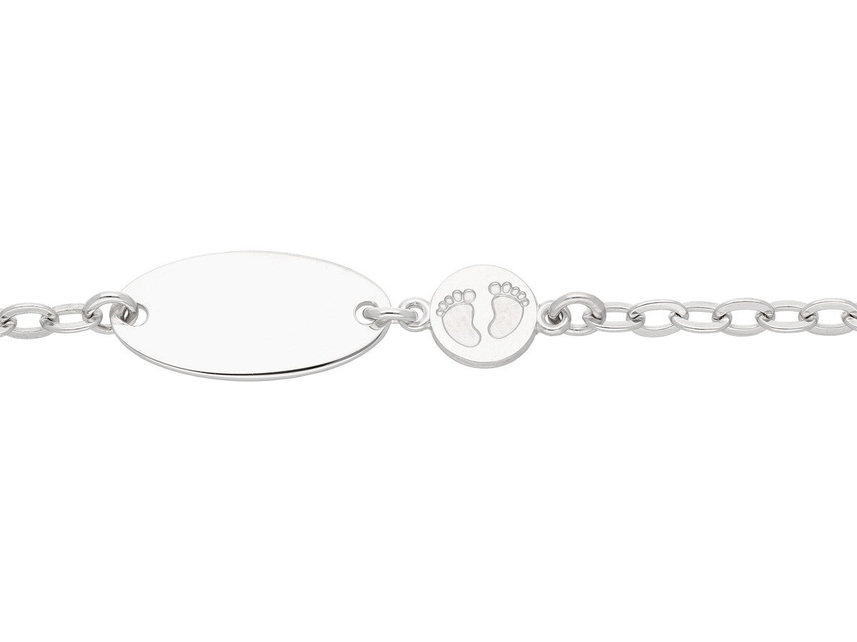 Das klassische Ankerketten-Design, poliert und rhodiniert, ist nicht nur wunderschön, sondern auch hautfreundlich. Die kleine Gravurplatte (8 x 15,9 mm) mit den niedlichen Babyfüßen macht das Armband zu einem ganz besonderen Erinnerungsstück – ideal zur Geburt, Taufe oder zum Geburtstag.